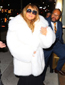 Donning a bustier covered up with a feathered bathrobe, Carey later sang a medley of songs while perched on a couch in the middle of the stage. Despite the large venue, the performance still felt intimate due to the floor-to-ceiling curtain that surrounded her. A montage of behind-the-scenes videos also played on an oversized screen, giving a glimpse into Carey's three-decade career.